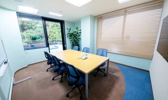 明るい壁紙の会議室。来客時や社内ミーティングで利用する他、資料を広げてアイデア出しをしたいときなどにも使えます。ブックシェルフに並ぶ本は貸し借り自由。また、ほしい本をリクエストすることもできます。