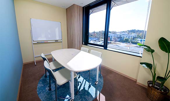 昼食時や一息つきたい時に利用するカフェスペース。社員価格で購入できる社内売店には、飲み物やお菓子の他、冷凍食品なども種類豊富に揃っています。豆から挽く本格的なコーヒーマシンもあり、好きなタイミングでコーヒーを飲むことができます。 カフェテラスでは、外の景色を楽しみながら昼食をとったり、休憩したりすることが可能。いわき市の暑すぎず、寒すぎない気候により一年中快適に利用でき、社員の憩いの場となっています。
