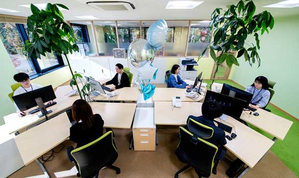 大きな窓に面したワークスペースは、開放的で明るい雰囲気が特徴です。広さのあるブーメランデスクや、観葉植物を置くことによって、社員同士の視線が重ならない配置になっており、集中して業務に打ち込める環境が整っています。